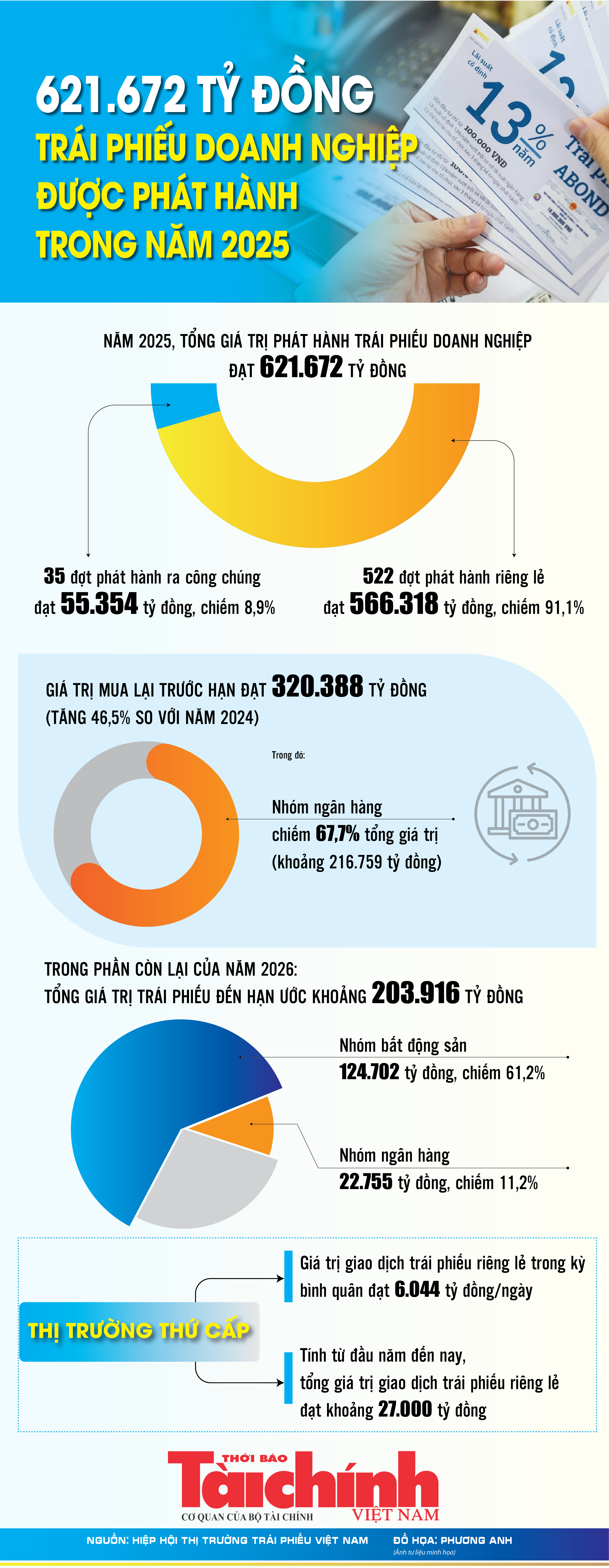 Infographics: 621.672 tỷ đồng trái phiếu doanh nghiệp được phát hành trong năm 2025