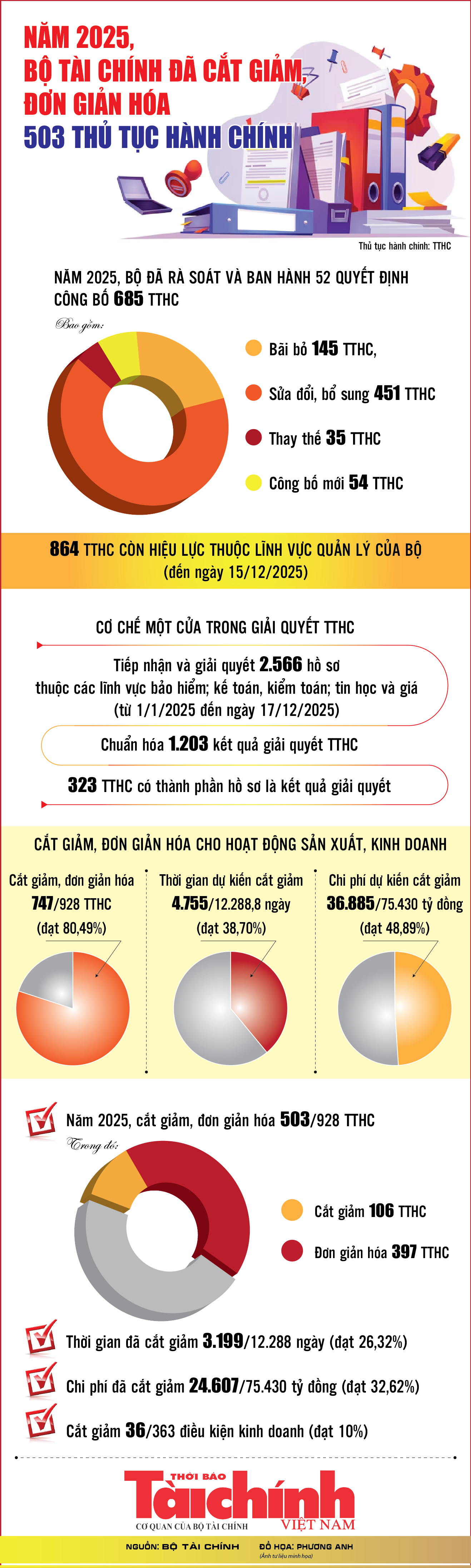 (TBTCO) - Theo Bộ Tài chính, năm 2025, Bộ đã thực thi cắt giảm, đơn giản hóa 503/928 thủ tục hành chính (TTHC). Trong đó, cắt giảm 106 TTHC, đơn giản hóa 397 TTHC. Tổng thời gian đã cắt giảm là 3.199/12.288 ngày, đạt tỷ lệ 26,32%; chi phí đã cắt giảm là 24.607/75.430 tỷ đồng, đạt tỷ lệ 32,62%.