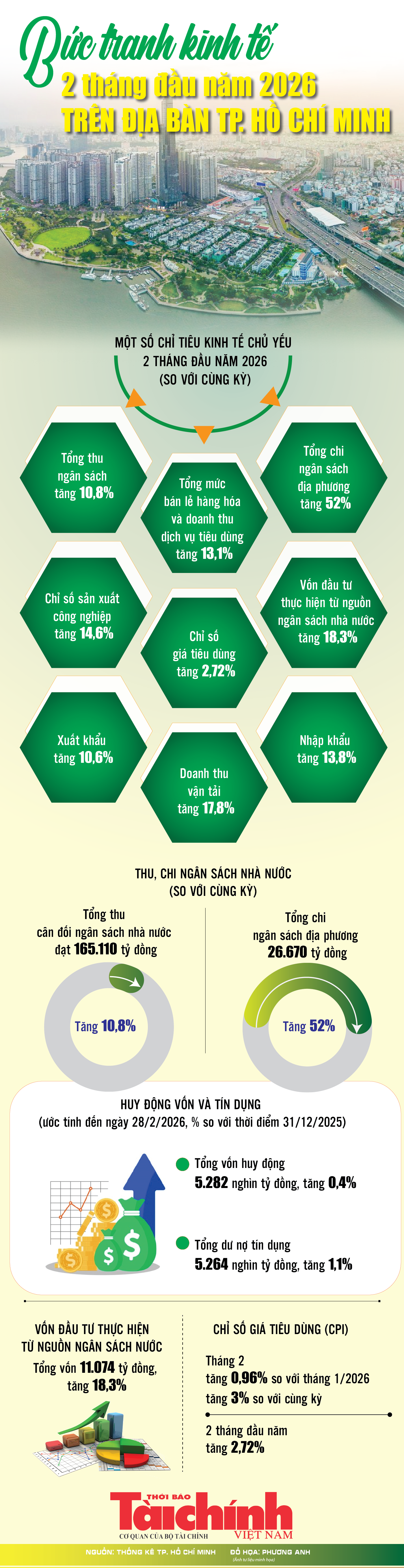 (TBTCO) - Theo Thống kê TP. Hồ Chí Minh, tổng thu cân đối ngân sách nhà nước trên địa bàn thành phố ước đạt 165.110 tỷ đồng; tổng chi ngân sách địa phương 26.670 tỷ đồng; vốn đầu tư thực hiện từ nguồn ngân sách nhà nước đạt 11.074 tỷ đồng; chỉ số giá tiêu dùng tăng 2,72%… là những con số kinh tế nổi bật trên địa bàn TP. Hồ Chí Minh 2 tháng đầu năm 2026.