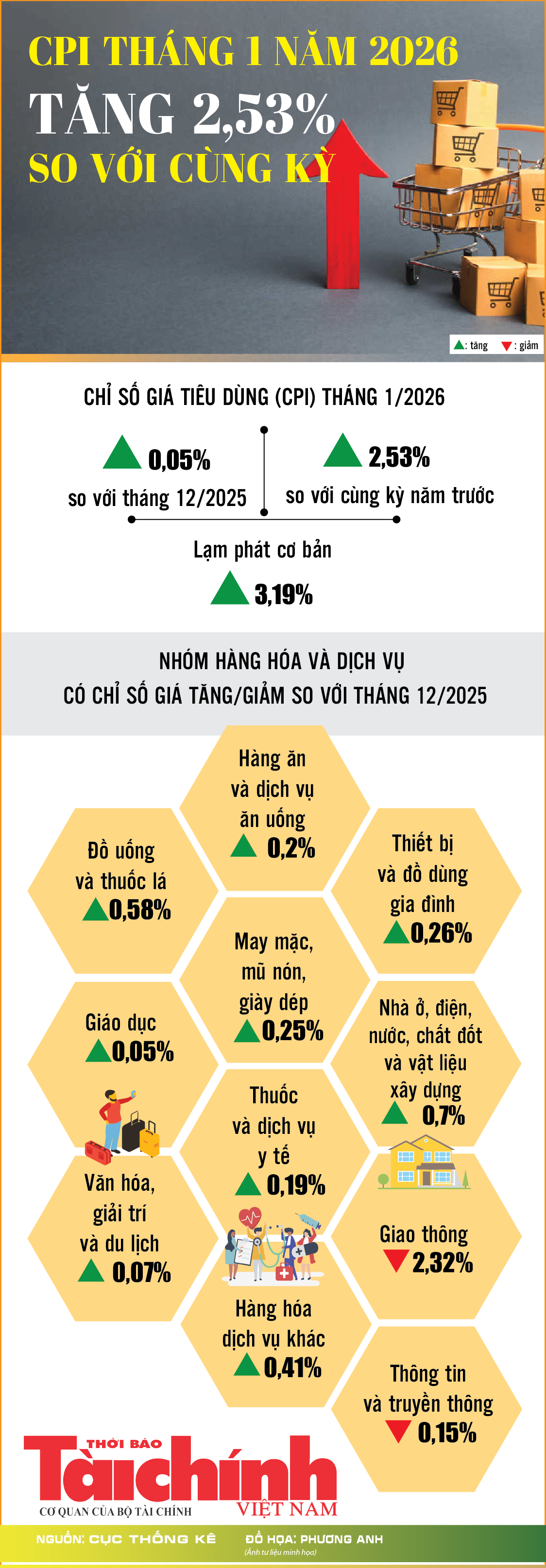 Infographics: Chỉ số giá tiêu dùng tháng 1/2026 tăng 0,05%