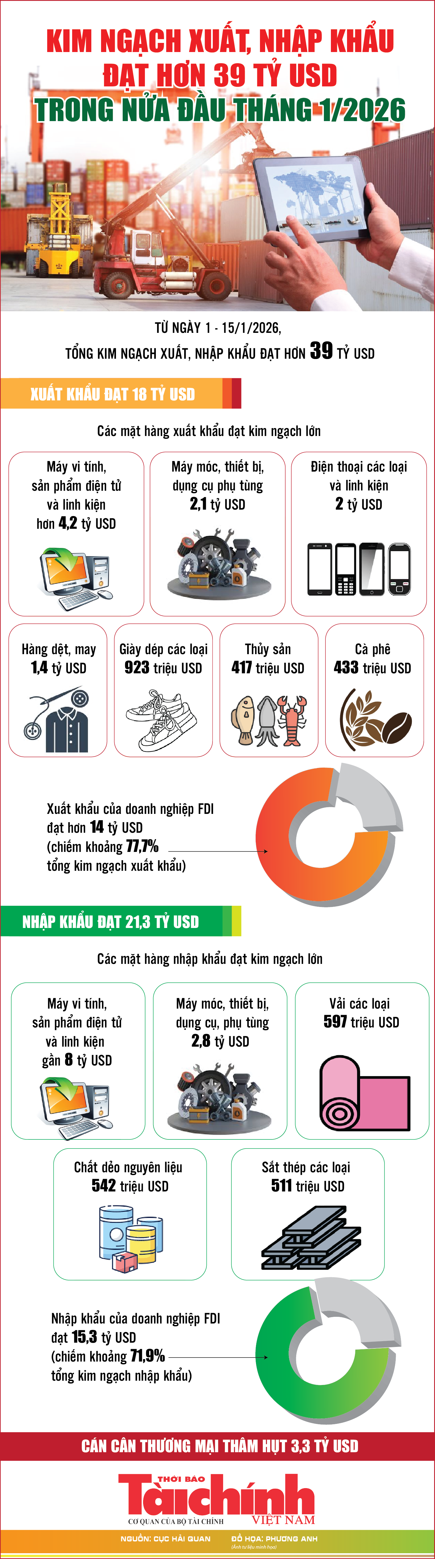 Infographics: Kim ngạch xuất, nhập khẩu đạt hơn 39 tỷ USD trong nửa đầu tháng 1/2026