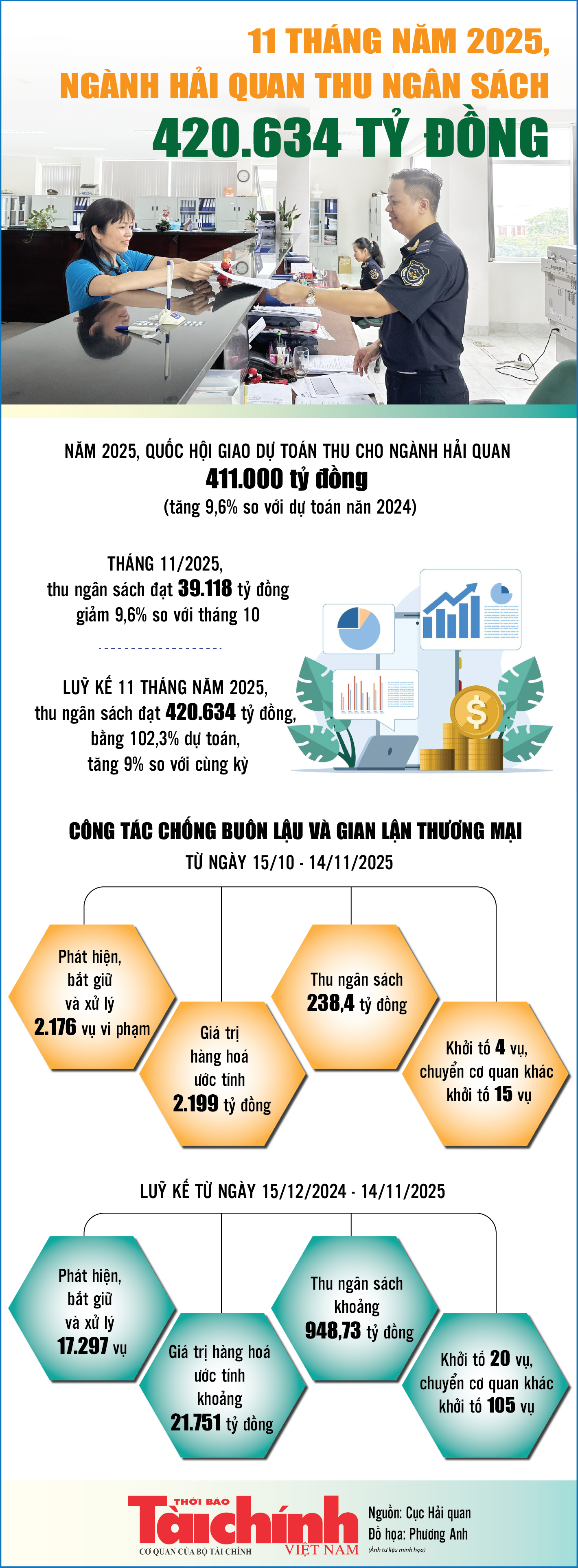 (TBTCO) - Theo Cục Hải quan, tháng 11/2025 thu ngân sách đạt 39.118 tỷ đồng; lũy kế 11 tháng năm 2025 thu đạt 420.634 tỷ đồng, bằng 102,3% dự toán, bằng 89,5% chỉ tiêu phấn đấu và tăng 9% so với cùng kỳ 2024.