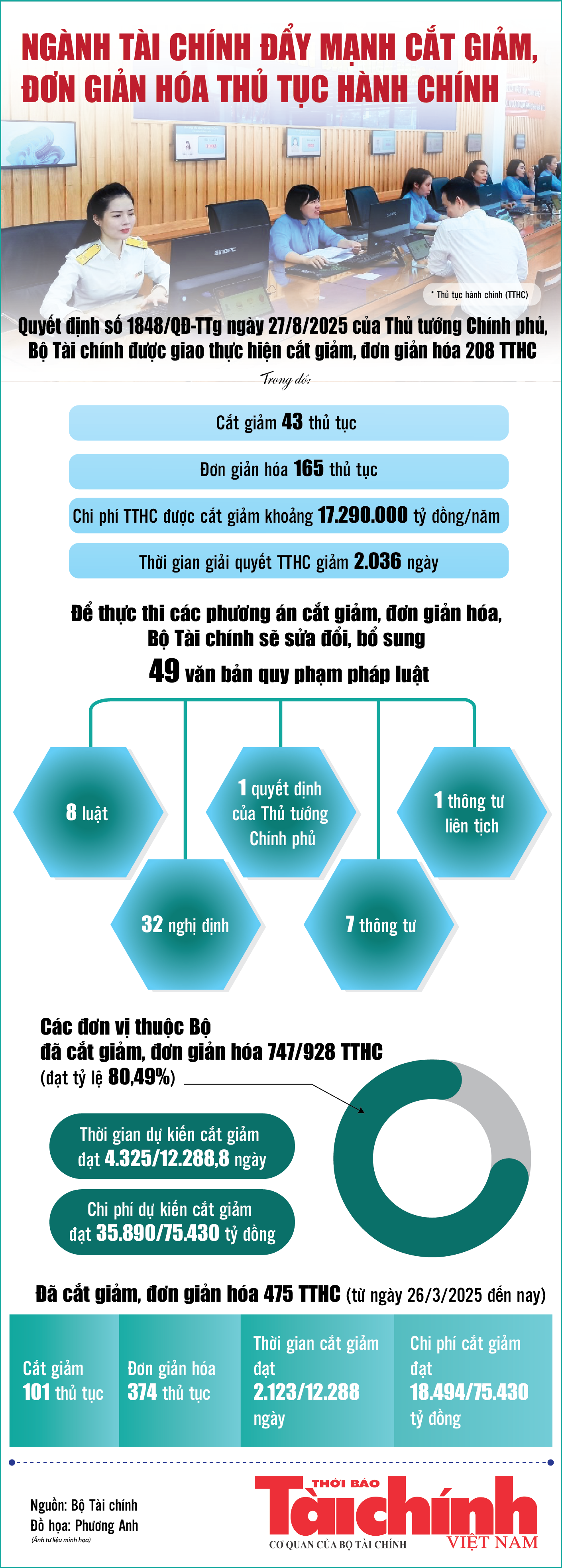 (TBTCO) - Theo Bộ Tài chính, từ ngày 26/3/2025 đến nay, toàn ngành Tài chính đã cắt giảm, đơn giản hóa 475 thủ tục hành chính. Trong đó, cắt giảm 101 thủ tục và đơn giản hóa 374 thủ tục. Tổng thời gian cắt giảm đạt 2.123/12.288 ngày; tổng chi phí cắt giảm đạt 18.494/75.430 tỷ đồng, góp phần cải thiện môi trường đầu tư, kinh doanh và nâng cao hiệu quả quản lý nhà nước trong lĩnh vực tài chính.