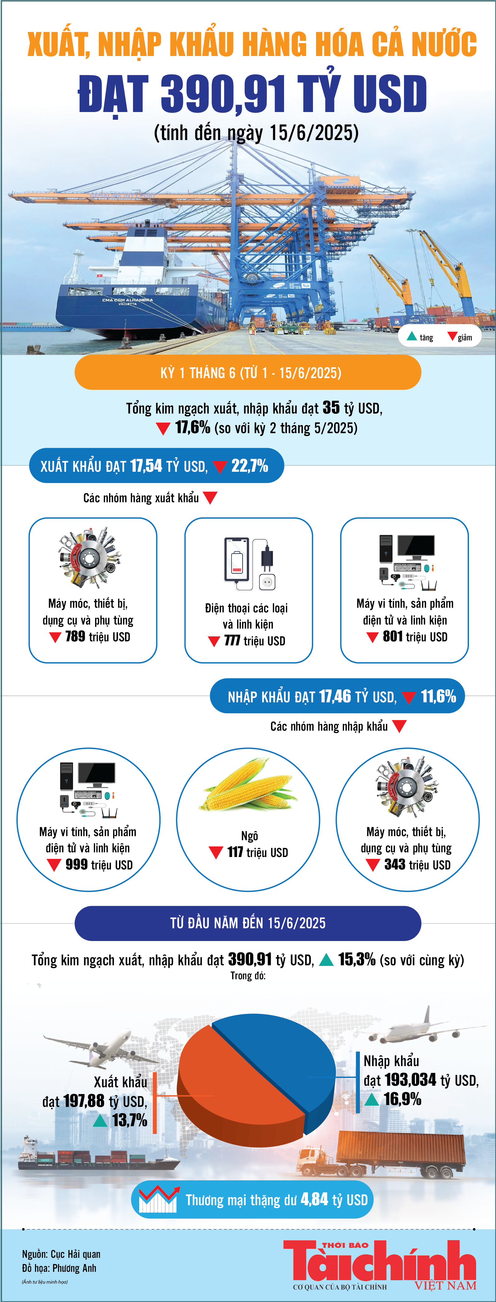 (TBTCO) - Theo Cục Hải quan, tính từ đầu năm đến 15/6/2025, quy mô kim ngạch xuất, nhập khẩu của nước ta đạt 390,91 tỷ USD. Trong đó, xuất khẩu đạt 197,88 tỷ USD; nhập khẩu đạt 193,034 tỷ USD; cán cân thương mại thặng dư 4,84 tỷ USD.