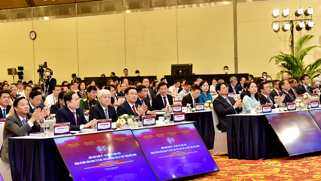 | Thủ tướng Chính phủ Phạm Minh Chính, Chủ tịch Quốc hội Vương Đình Huệ và các đại biểu dự Diễn đàn Kinh tế - Xã hội Việt Nam 2022. Ảnh: Lâm Hiển |