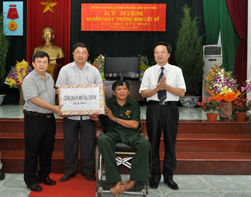 Ngày 24/7/213, Công đoàn Bộ Tài chính cùng công đoàn Thời báo Tài chính Việt Nam, Tạp chí Tài chính. Tổng cục Dự trữ Nhà nước đã tới thăm và tặng quà các thương bệnh bình của Trung tâm điều dưỡng Thương binh huyện Duy Tiên, Trung tâm Điều dưỡng thương binh huyện Kim Bảng, tỉnh Hà Nam. Các thương bệnh binh của Trung tâm điều dưỡng thương binh Duy Tiên (Hà Nam) luôn vươn lên chiến thắng bệnh tật, gương mẫu trong cuộc sống. Đến thăm hỏi, trò chuyện thân mật và tặng quà các thương binh, bệnh binh đang điều dưỡng tại 2 Trung tâm, ông Bùi Tuấn Phương đã bày tỏ sự cảm phục, lòng tự hào trước những cố gắng vượt qua khó khăn, vươn lên trong cuộc sống, cũng như những cống hiến, hy sinh to lớn của các đồng chí thương binh, bệnh binh cho sự nghiệp đấu tranh giải phóng dân tộc. Mặc dù mang thương tật nặng, gặp rất nhiều khó khăn trong sinh hoạt và cuộc sống, nhưng các đồng chí thương binh, bệnh binh vẫn lạc quan, yêu đời; kiên trì, bền bỉ khắc phục khó khăn, vươn lên chiến thắng bệnh tật, gương mẫu trong cuộc sống, thực hiện tốt lời dạy của Bác Hồ thương binh “tàn nhưng không phế”. Thay mặt đoàn, ông Bùi Tuấn Phương mong muốn các thương binh, bệnh binh và cán bộ, nhân viên của 2 Trung tâm phát huy truyền thống dân tộc, truyền thống “Bộ đội cụ Hồ”, khắc phục khó khăn, xây dựng Trung tâm ngày càng khang trang; luôn sống vui, sống khỏe, mãi là tấm gương sáng cho thế hệ trẻ học tập, noi theo. Bà Trần Thị Hằng Nga - Phó Chủ tịch Công đoàn Tổng cục Dữ trữ Nhà nước trao quà và tiền cho thương bệnh binh của Trương tâm điều dưỡng thương bình Duy Tiên. Trước đó ngày 23/4/2013, ông Nguyễn Tuấn Phương cũng đã cùng đại diện Công đoàn Học viện Tài chính, Trường Bồi dưỡng cán bộ tài chính, Công ty Mua bán nợ Việt Nam, Thời báo Tài chính Việt Nam trao nhiều phần quà bằng hiện vật và tiền tới đại diện các thương bệnh binh thuộc Trung tâm Điều dưỡng người có công tỉnh Phú Thọ. Đại diện Công đoàn Bộ Tài chính trao tặng quà cho thương bệnh binh thuộc Trung tâm Điều dưỡng người có công tỉnh Phú Thọ.
